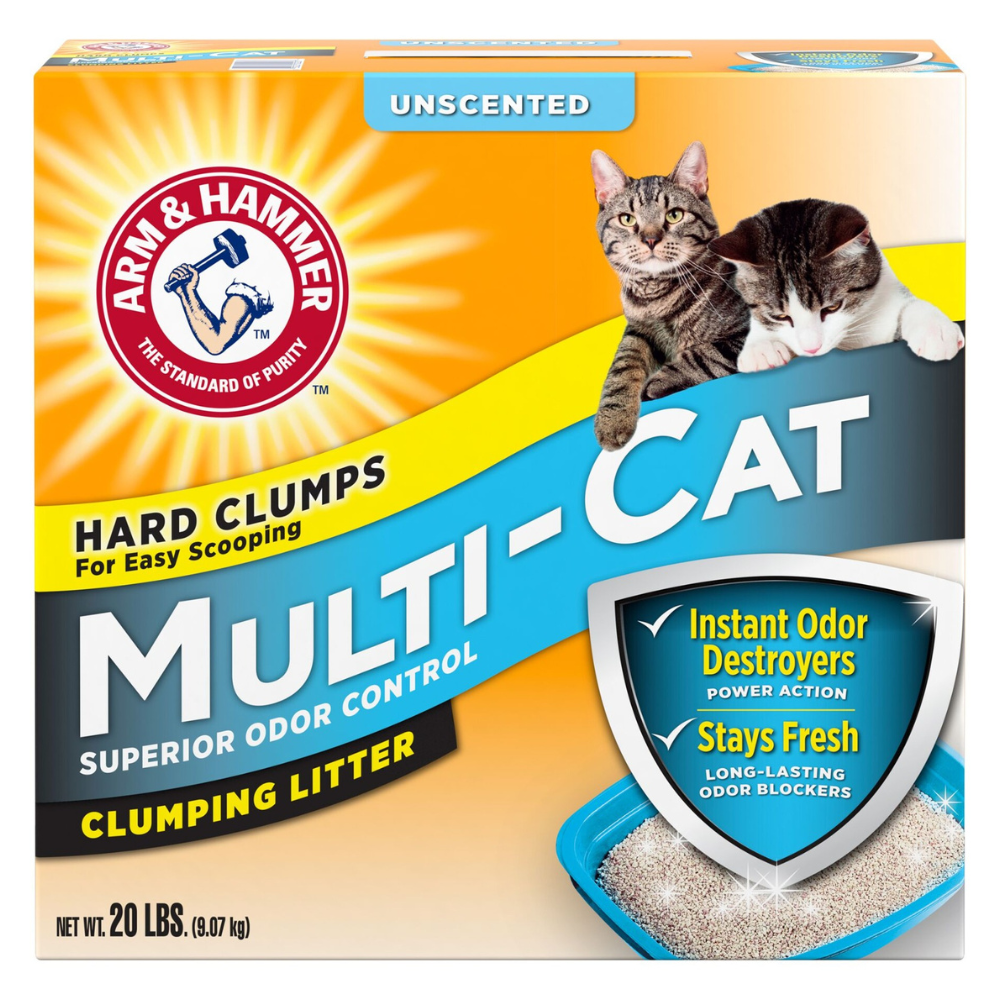 Arm & Hammer Multi-Cat Clumping Litter Unscented combina destructores de olores instantáneos y bicarbonato de sodio para eliminar los olores fuertes. Esta fórmula es ideal para varios hogares de gatos y no tiene perfume para gatos sensibles a las fragancias y dueños.