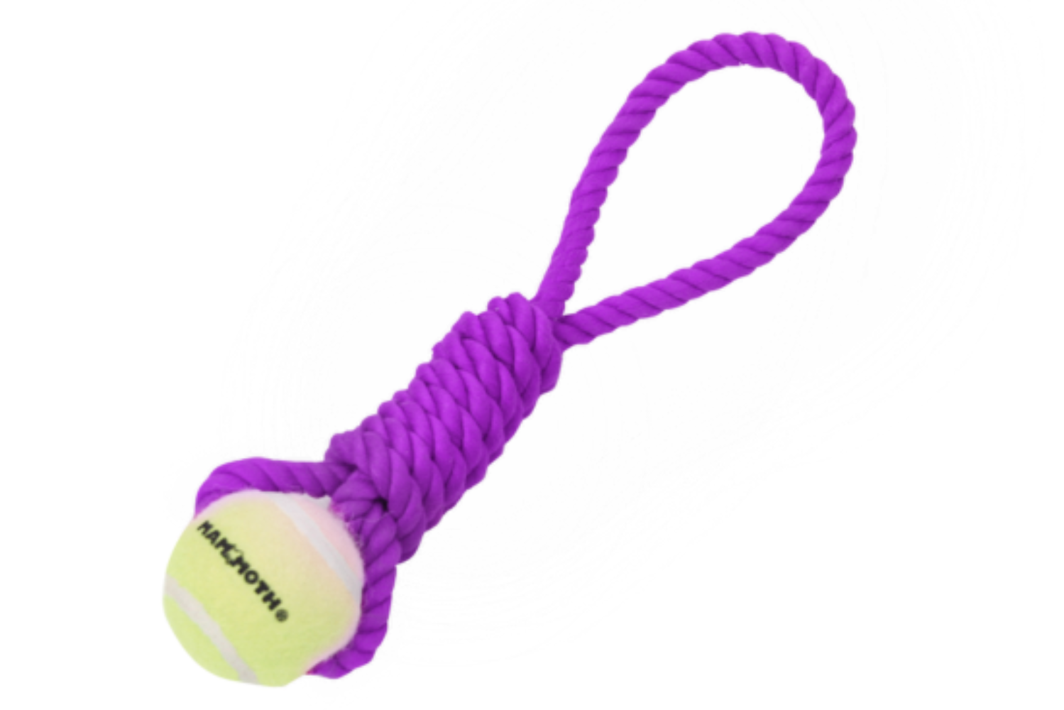 Mammoth Juguete Cuerda Morado Anudada con Pelota es un juguete muy seguro y duradero: la cuerda molar para mascotas Mammoth.