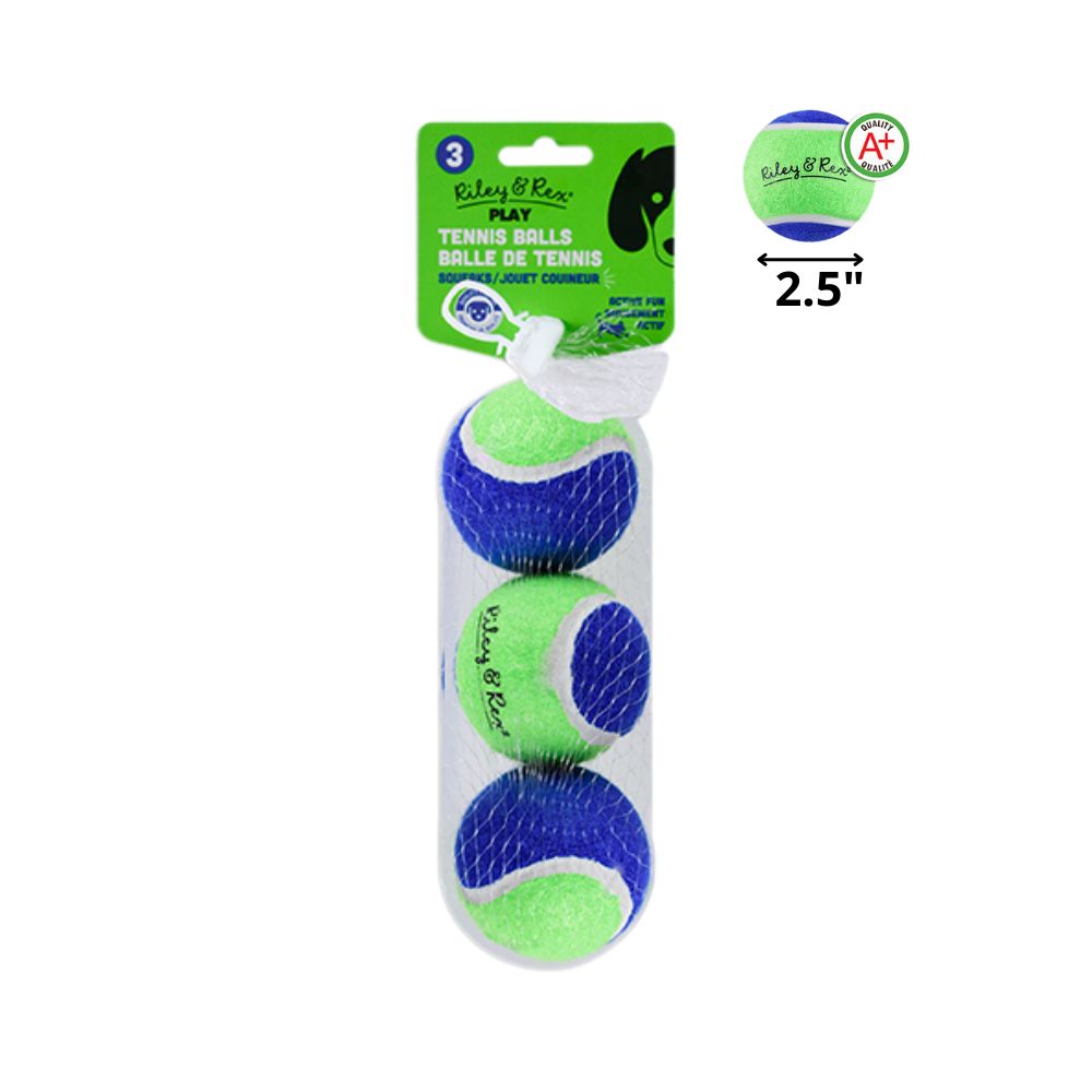 Riley & Rex Pelota de Tenis Azul para Perros 3pk Esta pelota de tenis duradera y de alta calidad no desgastará los dientes de un perro, para crear el juguete perfecto para buscar. Está hecho con un fieltro especial no abrasivo, en comparación con el material abrasivo de las pelotas de tenis normales.