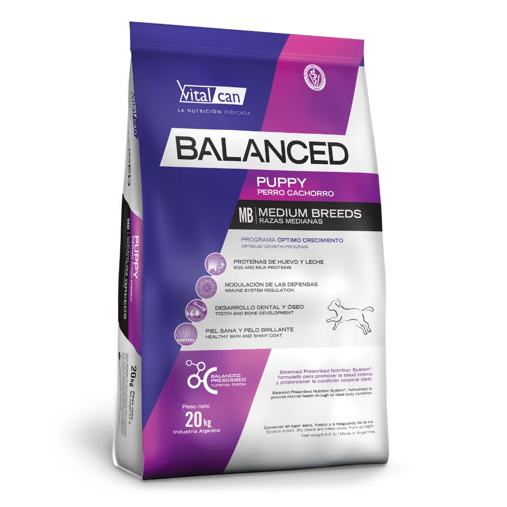 Vitalcan Balanced Puppy está diseñado para cubrir las necesidades nutricionales específicas de los cachorros de razas medianas. Su Programa Óptimo Crecimiento incluye proteínas de alta digestibilidad (huevo y leche), DHA para el desarrollo cerebral, y antioxidantes naturales que promueven un sistema inmunológico fuerte. Además, contiene fibras naturales que favorecen una digestión saludable y nutrientes que contribuyen al desarrollo dental y óseo.