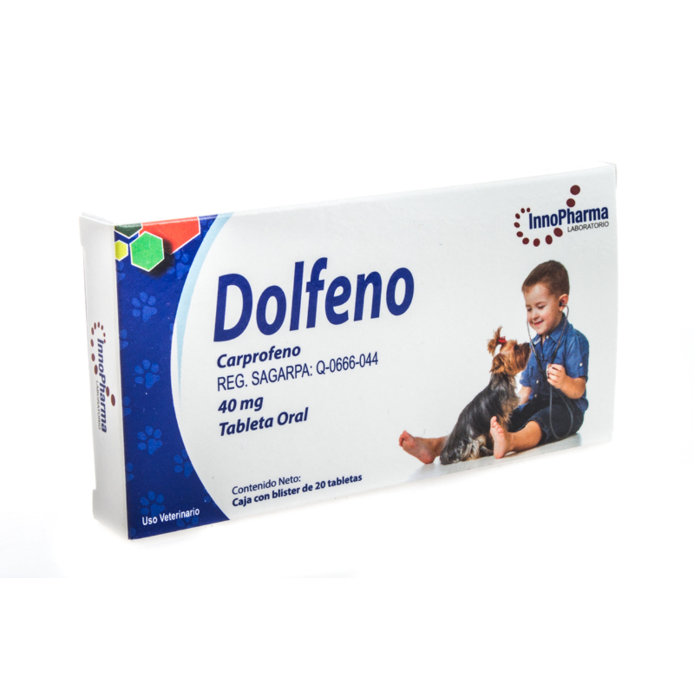 Dolfeno 40mg Antiinflamatorio analgesico y antipiretico que esta indicado para el tratamiento y control del dolor e inflamación, crónico y agudo, causados por osteoartritis, enfermedad articular degenerativa, afecciones musculares, traumáticas, ostearticulares y procedimientos quirúrgicos en tejidos blandos, articulaciones y huesos en perros.