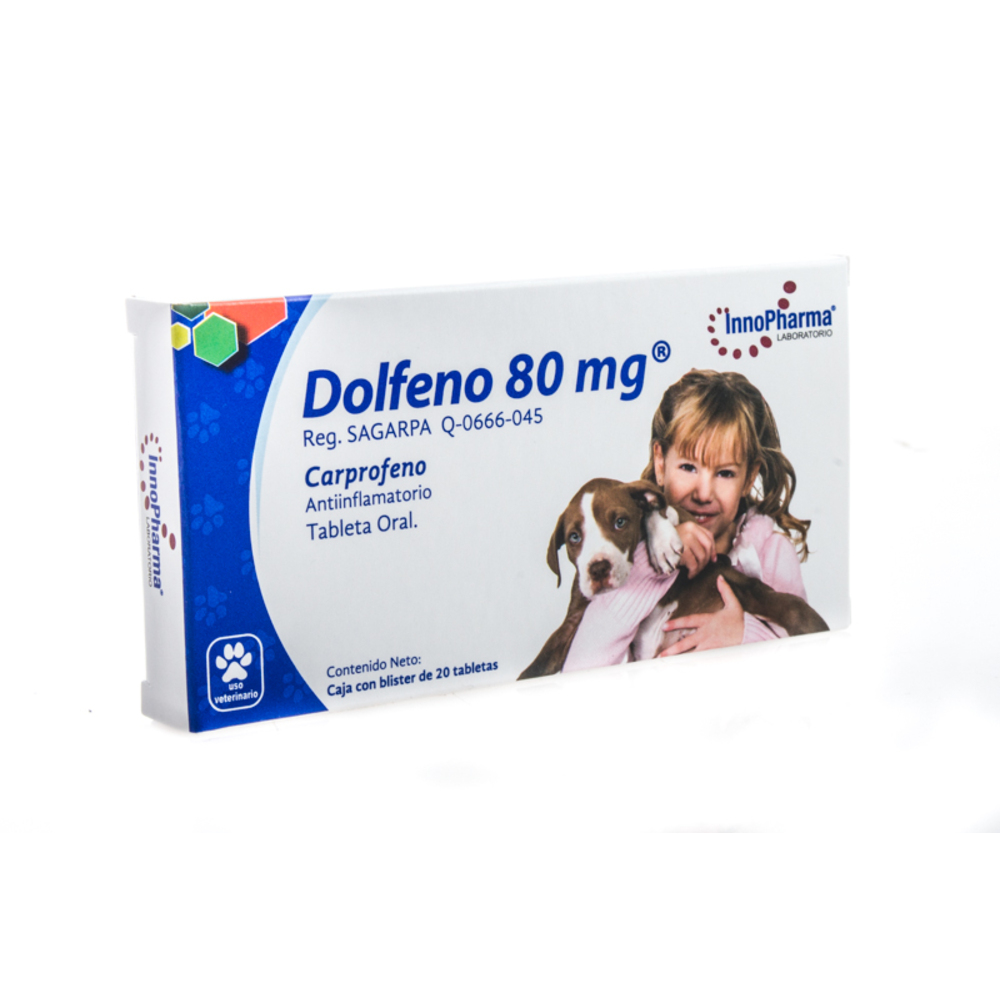Dolfeno 80mg Antiinflamatorio analgesico y antipiretico que esta indicado para el tratamiento y control del dolor e inflamación, crónico y agudo, causados por osteoartritis, enfermedad articular degenerativa, afecciones musculares, traumáticas, ostearticulares y procedimientos quirúrgicos en tejidos blandos, articulaciones y huesos en perros.