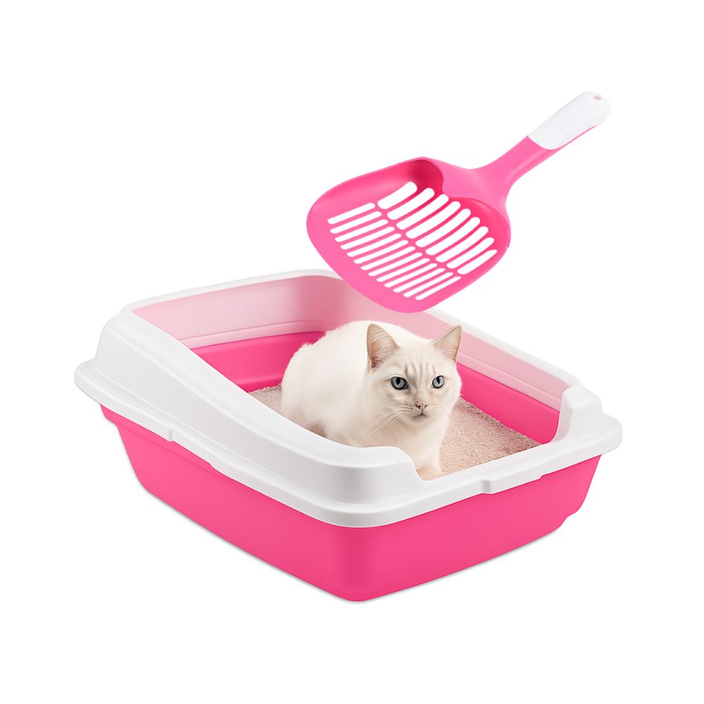 Arenero para gatos + Pala para arena Riley & Rex en color rosado, práctico y resistente, ideal para mantener la higiene de tu mascota.