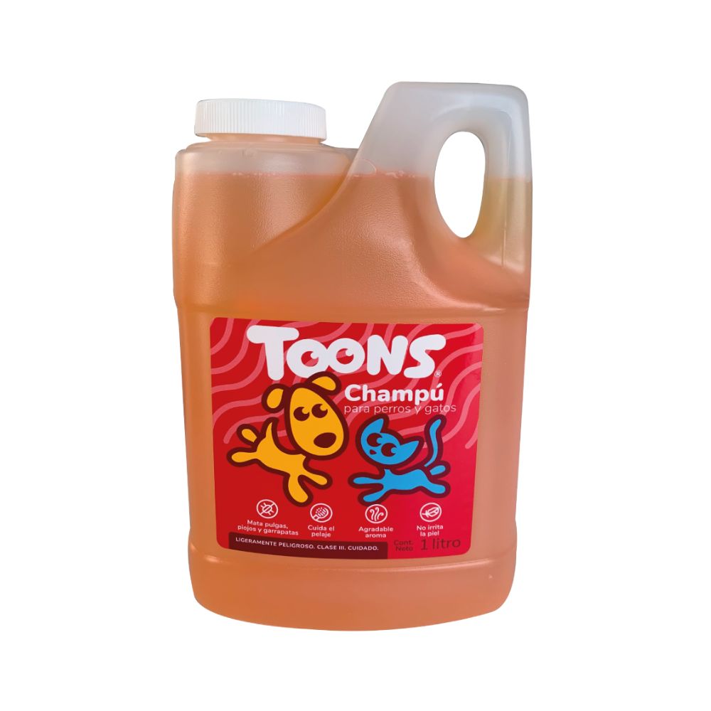 Toons Champu para Perros y Gatos Nuestro champú mata pulgas, piojos y garrapatas, no irrita la piel de tu mascota, cuida el pelaje y le deja un agradable aroma. El champú Toons elimina de manera efectiva la suciedad y la mugre del pelaje de tu mascota. Es especialmente formulado para hacer abundante espuma y tener mayor rendimiento.