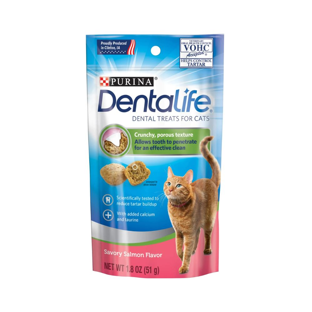 Purina DentaLife Salmon Cat Golosinas de Salmon para gatos están especialmente diseñadas con una textura más porosa que las golosinas tradicionales para apoyar la salud dental de tu peludo. La textura porosa ayuda al diente a penetrar en la golosina, rodeando todos los lados del diente para reducir la acumulación de sarro.